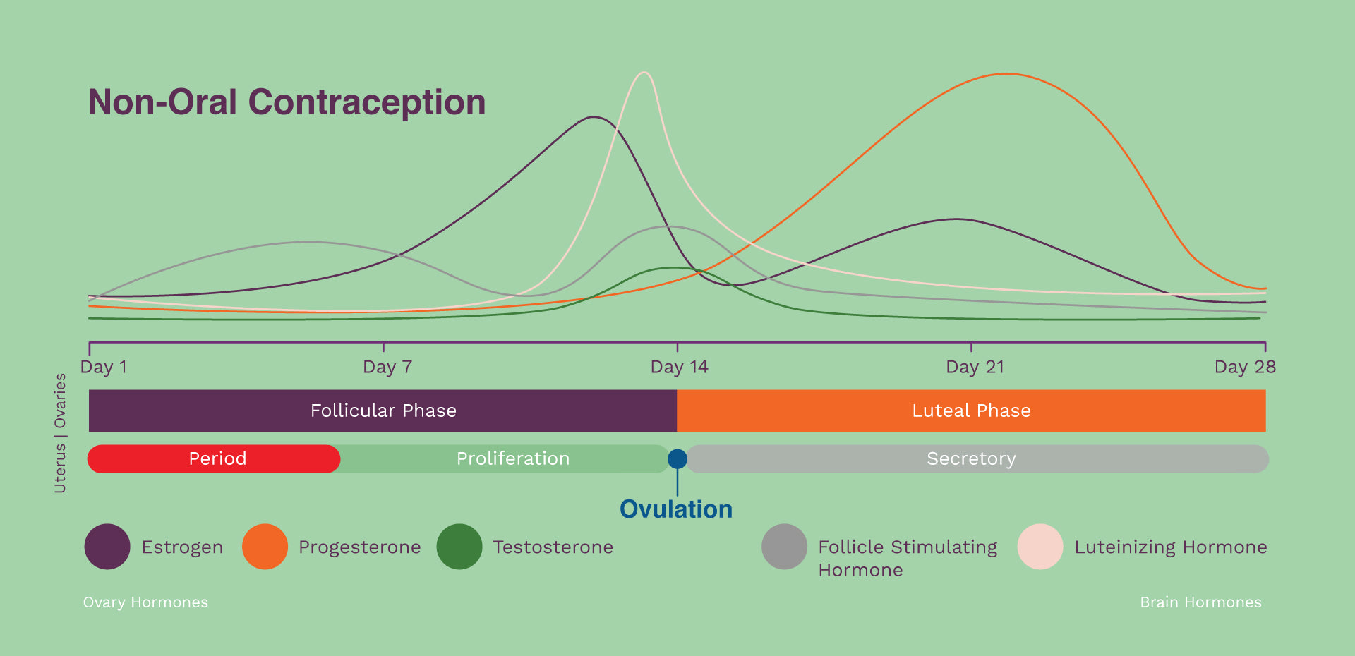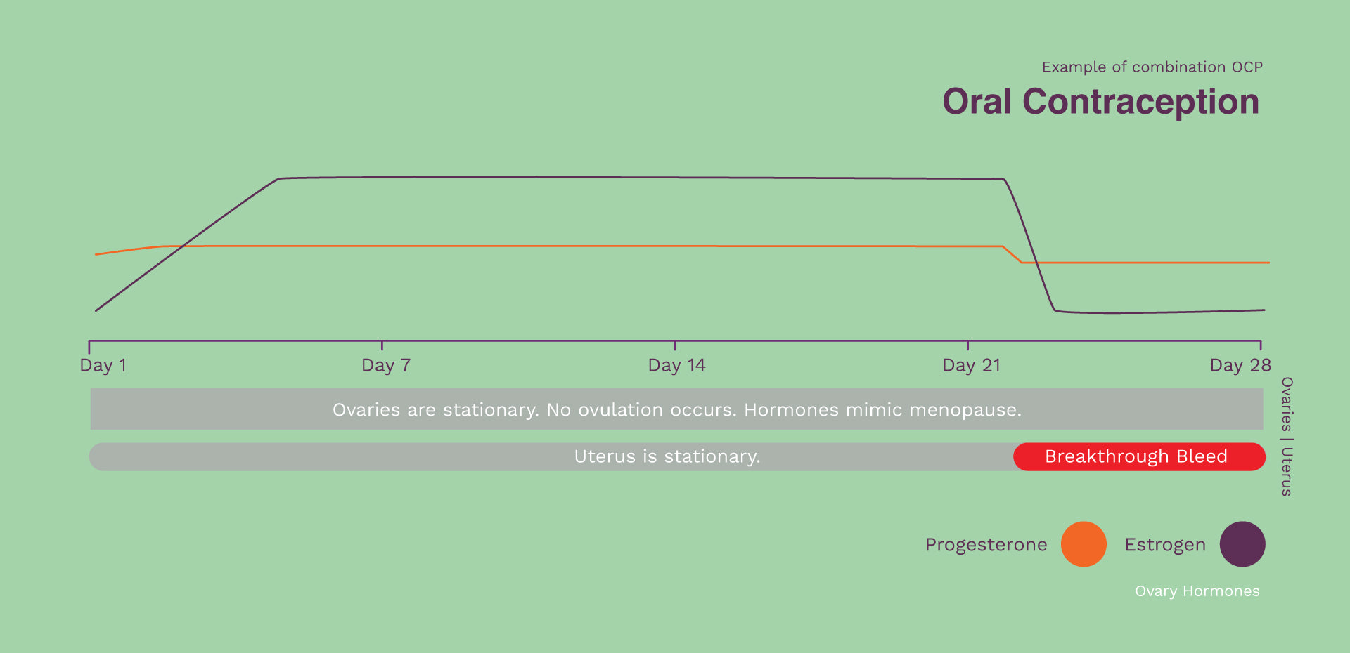 Below is an example comparison of being on combined oral contraception. It essentially puts our hormones to sleep. As you can see we do not ovulate, which means we miss out on fundamental health benefits of testosterone and fluctuating progesterone.
